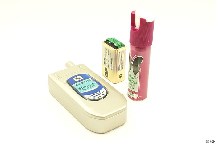折りたたみ携帯電話サイズで手の平にすっぽりと収まり、手に持ったまま歩いても違和感がありません。コンパクトなので手に握ったまま手をポケットに入れていてもOK。やはり護身用品はコンパクトが正義ですね。女性を中心に非常に高い人気ぶりなのはこの持ち歩きやすさが評価されてのことです。また、このスタンガンにはSP-1催涙スプレーもサービス付属していますので是非ご活用ください。