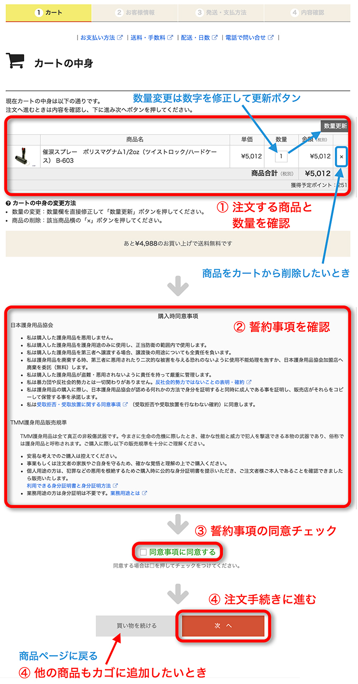 図の手順に沿い、ご注文商品の品番と数量を確認し、用途、身分証明、購入時誓約事項について確認してください。誓約事項に同意し、同意チェックの上で次に進んでください。
