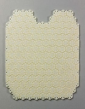 - 防刃板の2.5cmの六角ピースは「防刃チョッキ」の着用時に人力による刃物での突き刺しで最も危険な「刃物の跳ね返り」の際に首回りや顎(あご)回り、顔面周辺に「二次的に命中」して最終的に負傷する可能性を軽減するよう設計されています。